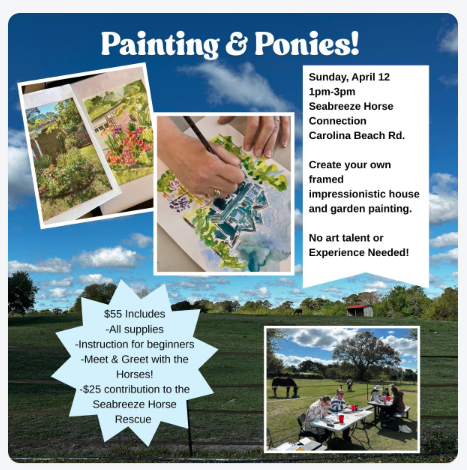 Wilmington artist Katie Elzer-Peters will help you create a traced sketch of your photo of choice and will then guide you in painting and adding details with colored pencils and ink pens. Ticket cost includes a $25 donation to the rescue horses at Seabreeze Horse Connection. Enjoy a meet and greet with the Seabreeze herd while you wait for your painting to dry!
